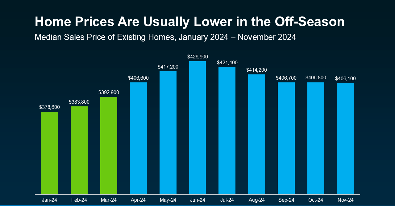 Historically, home prices tend to be at their lowest point in the winter months, too. According to data from NAR, home prices last year were at their lowest in January, February, and March — right before the spring buying season kicked in (see graph below):